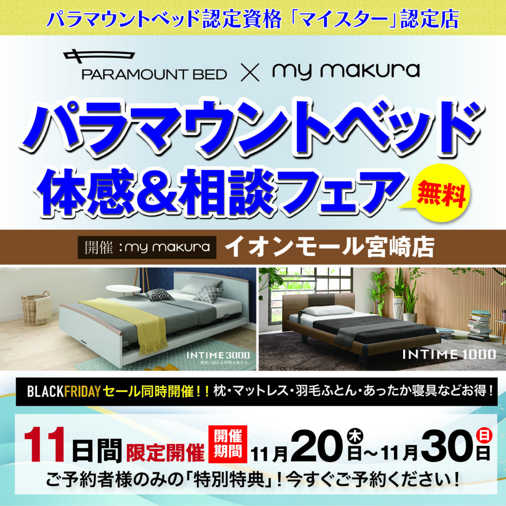 11月20日(木)~ 11月30日(日)の期間、マイまくら イオンモール宮崎店で特別フェアを開催致します。眠りの自動運転でお馴染みのパラマウントベッドが展開する電動ベッド「INTIME 3000」と日本初のオーダーメイド枕でお馴染みのmy makura が展開するマットレス「マイマット」のコラボレーションベッド体感会をお見逃しなく。