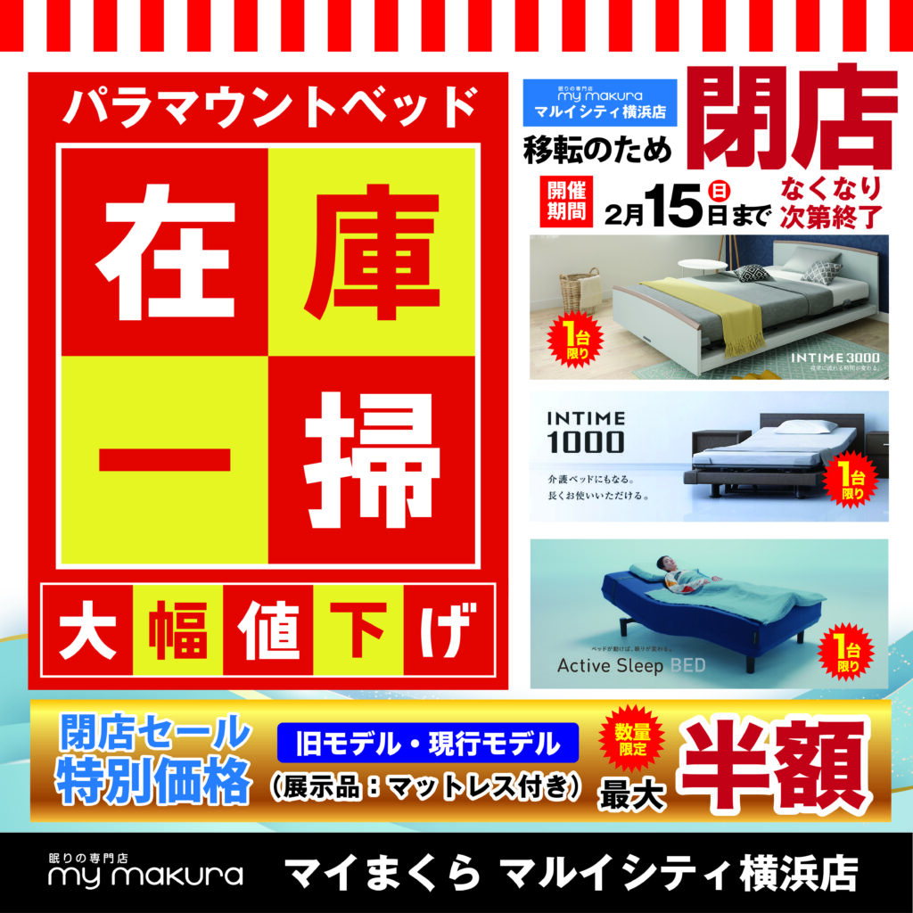 2025年12月20日(土)~2026年2月15日(日)の期間、マイまくら マルイシティ横浜店で閉店SALEを開催致します。眠りの自動運転でお馴染みのパラマウントベッドが展開する電動ベッド「アクティブスリープベッド」/「INTIME 3000」と日本初のオーダーメイド枕でお馴染みのmy makura が展開するマットレス「マイマット」のコラボレーションベッド体感会をお見逃しなく。