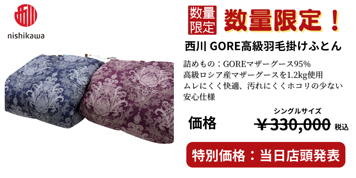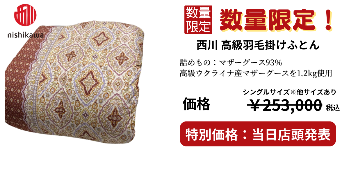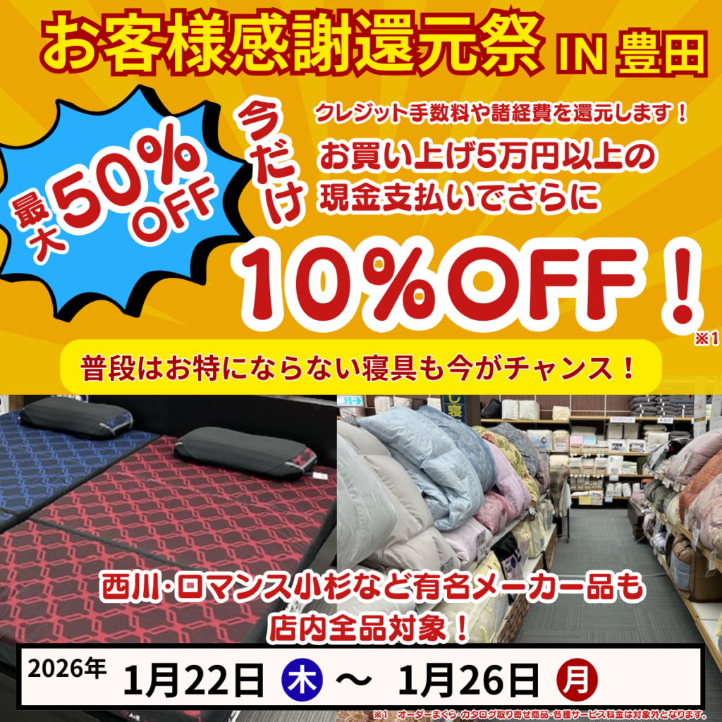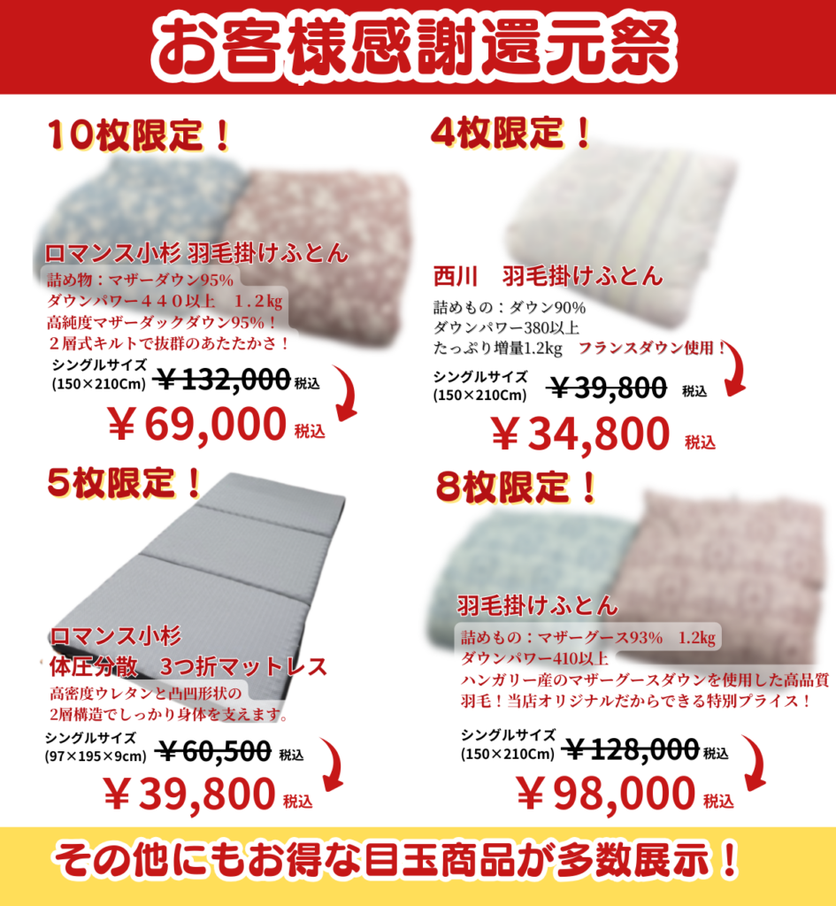 お客様感謝還元祭として、現金でのお支払いに限り割引特典!クレジット手数料や諸経費などかからない分を割引で還元させていただきます!さらにお買得品は最大50%OFFの特別価格に!普段はお得にならない「西川」「ロマンス小杉」「パラマウントベッド」など一流人気寝具メーカーの品もお得に手に入れられるこの機会をお見逃しなく!