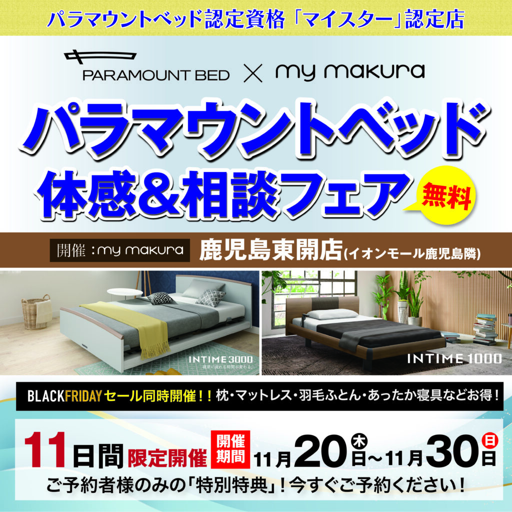 11月20日(木)~11月30日(日)の期間、マイまくら ふとんの今藤 東開店で特別フェアを開催致します。眠りの自動運転でお馴染みのパラマウントベッドが展開する電動ベッド「INTIME1000」/「INTIME 3000」と日本初のオーダーメイド枕でお馴染みのmy makura が展開するマットレス「マイマット」のコラボレーションベッド体感会をお見逃しなく。